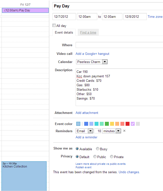 1. First I started using Google Calender to budget my paychecks from my "day job."
