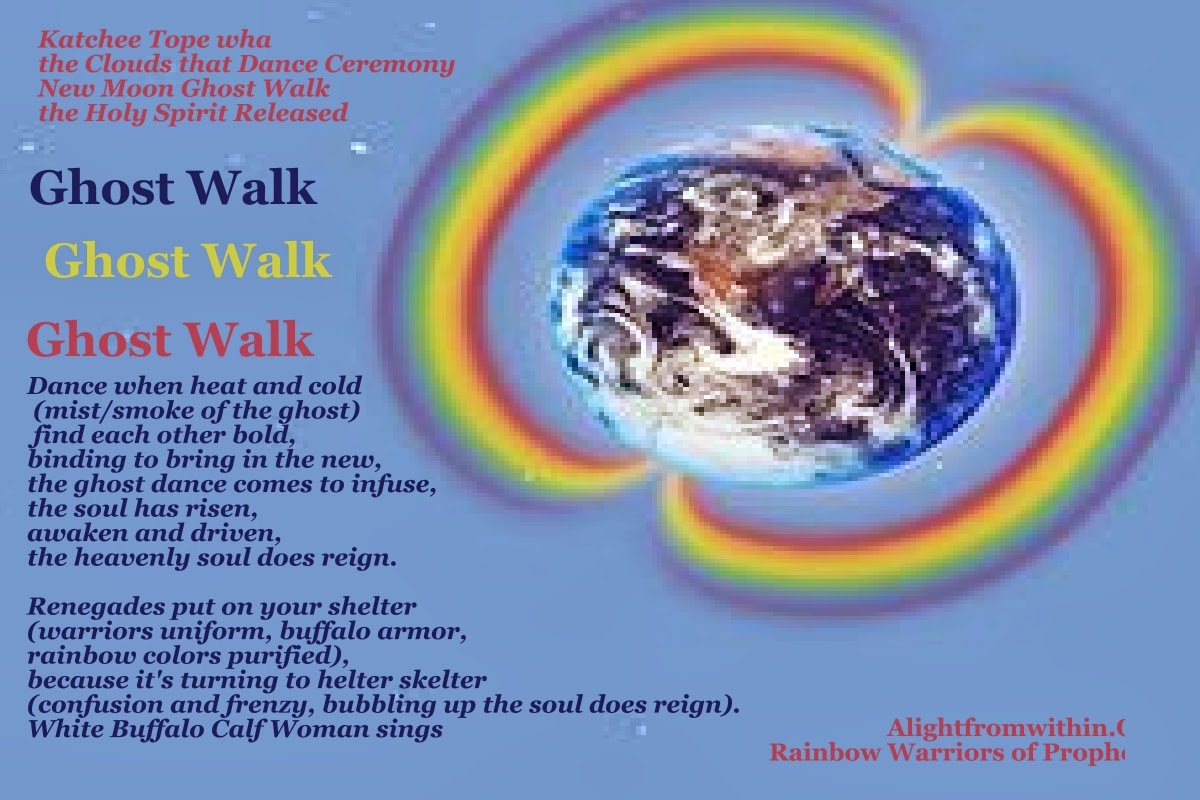 Event: Ghost Walk (New Moon Dance, monthly three day gathering with the family and friends, relatives in the winds)Official Title: Katchee Tope wha: “the Clouds that Dance Ceremony” The ghost walk or ghost dance, the holy spirit within that soars, free as a bird in song and dance. Holy is the sound, praise for the world to help heal all the world to get along. Each new moon join us around the world, to birth in light from within the darkness, with Rainbow Warriors of Prophecy http://www.iamasundance.info in the k/night.