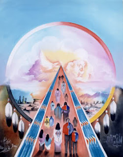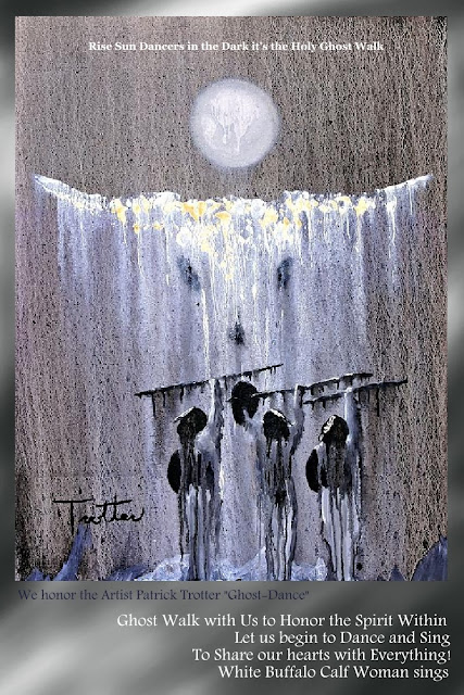 All my Relatives, it's sun dancing with the New Moon, the Holy Ghost Walk. I send my love to you in the sacred blue (seas of you and me), we are going now to show the "POW". We will dance and sing and bring in the humming brings, the sacred drum will lead us on the show. Now it's time to lead my holy stillness (spirit within) achieve the locomotion I need to find my waves. Inside I sing. I will lead you deers in to where there is no fear, to walk upon the land as solemn men. Yet inside we shall shine divine, a lot of merry will chime, inside we will light the way in peaceful glee. And we will dance and sing in control of everything, because the soul will be let out to sing. I send my love to you, where there is such a fuse, where the sparkling dim will dew a dance. And we will share a tear and make it really reel, where the hairs and streams will find the winds. Come now, give a cheer, it's White Buffalo Calf Woman near, to hold us in the hands of God's love. We beat a dance and song to bring in - out to the clouds, to dance a spark of light inside of you. And with this beating drum, Holiness David on the Run. We are dancing to find the shooting stars (Holiness David Running Eagle Shooting Star drums for us to day). And we shall share a dance and sing and make romance because we remembered about our liberty. The soul inside takes us for a ride and now it's time to keep all clean. I bless my Great Spirit wear (sacred buffalo robe, four directions in rainbow colors), my soul I must tear, the white buffalo (prayer cloth of many colors) around my shoulders near. We are the dreaming suns, upon the holy rungs (stepping stones to the Great Spirit of all my Relatives, relativity in the fields, we deal). We are taking hold of everything. And with this said today, let us be led this way, the holy ghost inside is leading a parade. We are a journey of love, going over the doves, where they will know the peaceful waves. And inside of us, where we lance (cut) and dust (diamonds) (brilliant shining lights), the whole cosmic world will be displayed. Shine, shine inside my Sun Dancer. Shine shine the Morning Star (eight sacred directions, four colors inside, four colors outside, where I stand I stream, all the colors of the beams. I bow and bless the sacred nine streams and four holy directions). Let me be the great pretender (I will try), and let my crazy light begin and cleanse up all this sin. I bless it clean. All the colors of the stream. All the colors of the dream, my hands to the winds. I hold you close today, to make us cheer a lovely wave. Heaven send us home, to make us live a loom. Together, I say Deer/Dear, I love your cheer. I let my hair down. I let it out like a clown. I beat with my feet. I feel like the sleet. And with all this, stones. I want to bury all my bones. Forgive the past, for I will know, the good red road will flow. Aho, aho, aho, my spirit blows. Aho, aho, aho my spirit really knows. Aho, aho, aho, make my soul glow. Ghost walking today, just another display of the Sacred clouds in the sky (Katchee Tope wha: “the Clouds that Dance Ceremony”), sharing all the colors of the waking wise. It's heavenly tunes. We are here to know the blue, true blue, true blue, relatives we knew. Come on home and shine with me. It's time to be heavenly..... White Buffalo Calf Woman sings and Holiness David Running Eagle Shooting Star drums for all the Sacred Suns, Elders of the Rainbow Clan, you and you and you and you and you and you and me too!