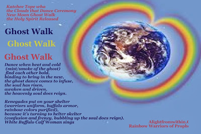 Relatives on the Great Circle, Sharing with you, our Holy Ghost Walk. Join in each new moon. We are on our last of three days of gathering, singing and dancing together. Share your holy ghost, the spirit inside with the most. Develop your inner sight, with a soul that lets it out. Your devoted servant, White Buffalo Calf Woman your Twin Deer Mother, elder crystal child, alightfromwithin.org, Rainbow Warriors of Prophecy