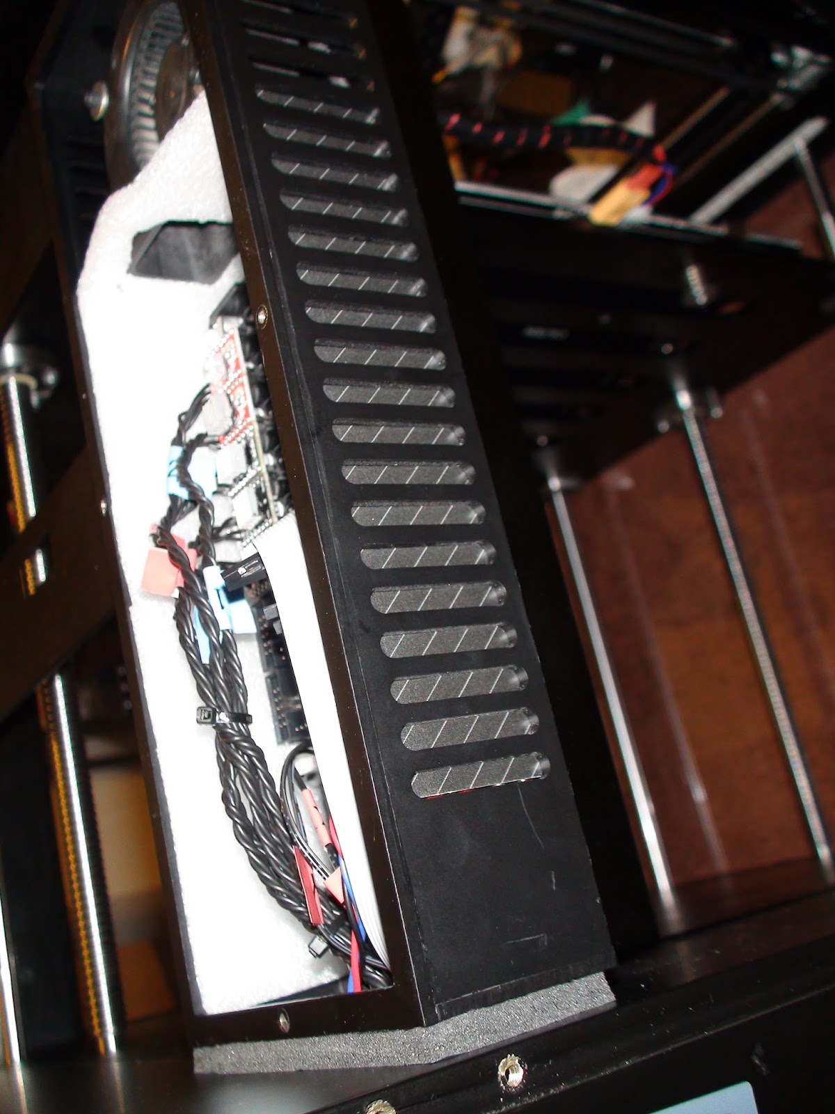 I just used the packing foam because it was handy. I later found some back cardboard and used that to make it nicer.#3 Cut a matching set of intake vents in the clear plastic panel, then use foam strip to seal the electronics back intake to the now cut through fresh air intake at the rear of the printer.
