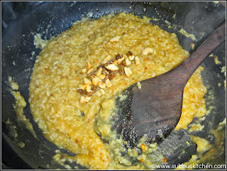 - Add fried moong dal and rice and 4 cups of milk in a vessel and pressure cook it. Leave atleast 7-8 whistles so that the rice is mashed well.