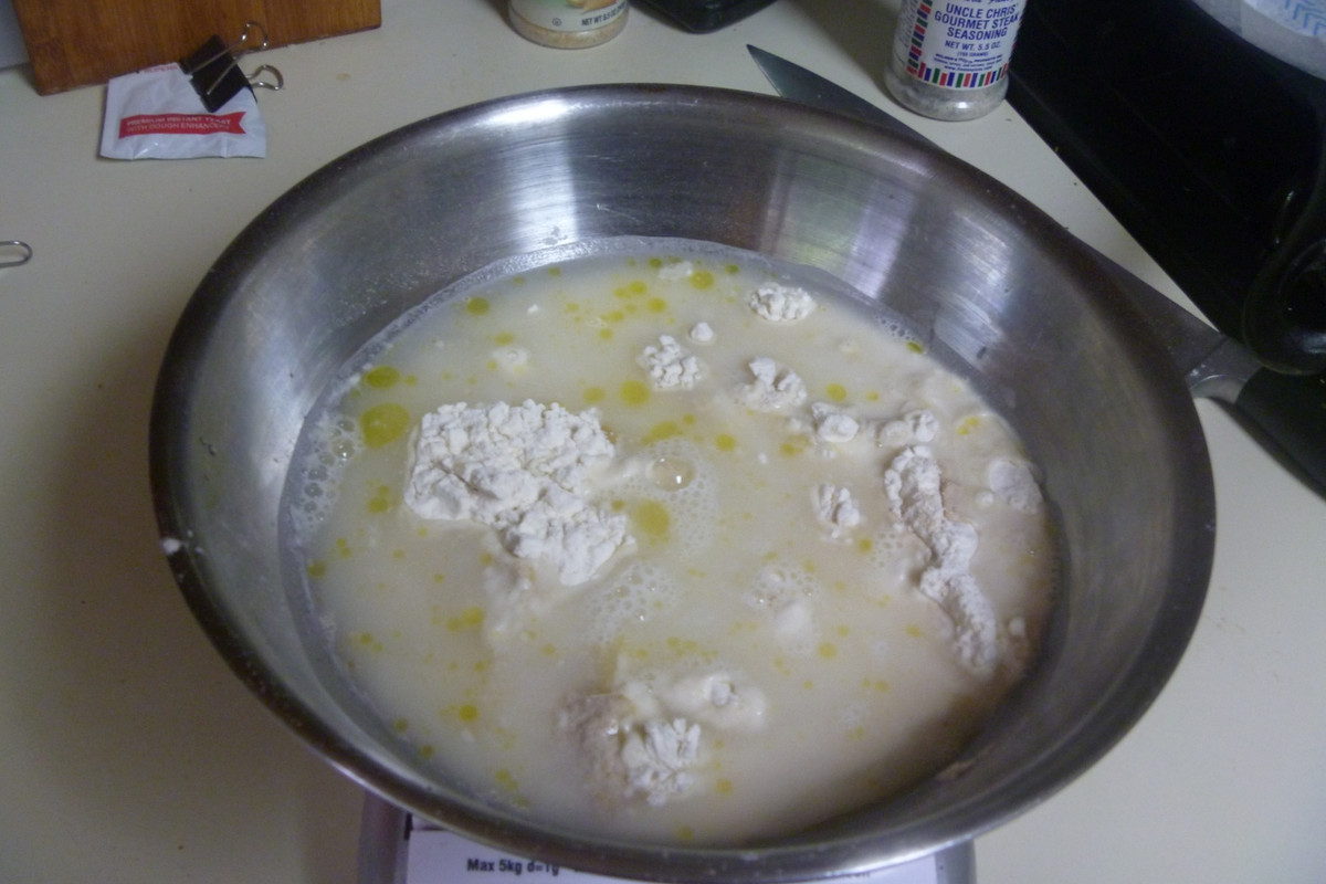 > Mix it half-assedly and allow flour to rehydrate 10 minutes. Turn