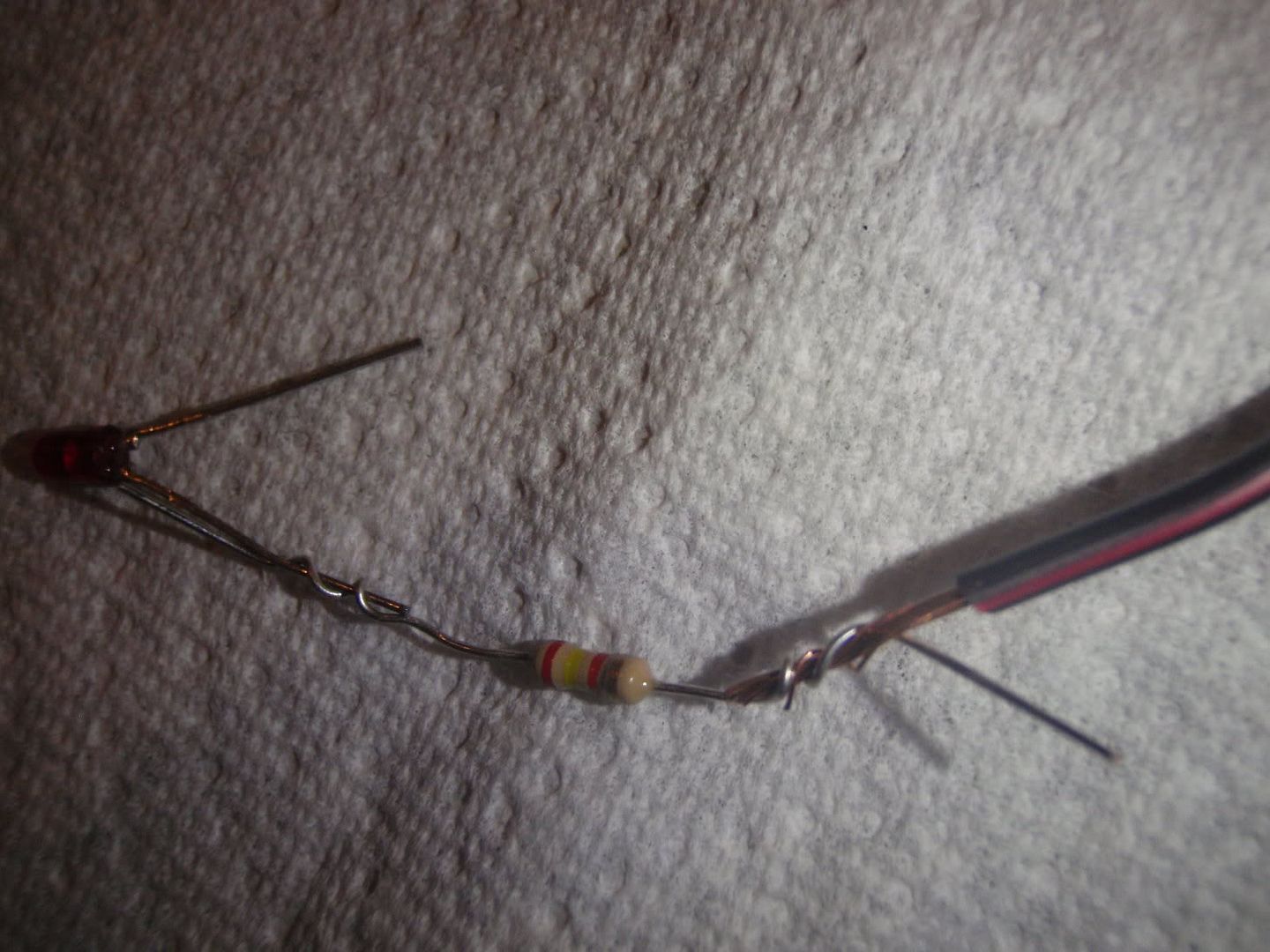 The resistors go right on one of the LED legs. Twist the resistor leg