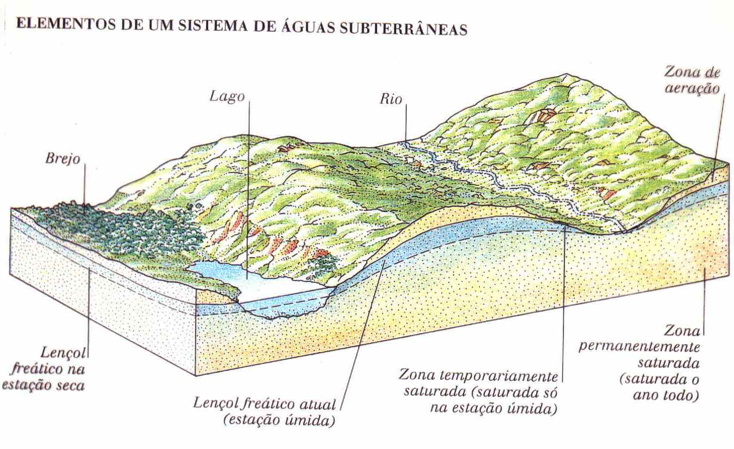 Em geologia considera-se água subterrânea toda aquela água que ocupa todos os espaços vazios de uma formação geológica, os chamados aquíferos. Nem toda água que está embaixo da terra é considerada como água subterrânea por haver uma distinção daquela que ocupa o lençol freático, que é chamada de água de solo e tem maior interesse para a agronomia e botânica. Um maciço rochoso ou um solo argiloso, pode servir de leito para as águas subterrâneas, pois permitem que ela se acumule e elimine todos os espaços vazios do solo. Em geral, as águas subterrâneas são armazenadas ou em rochas sedimentares porosas e permeáveis, ou em rochas não-porosas, mas fraturadas. Neste último caso, as fraturas geram um efeito físico similar ao da permeabilidade. Um caso menos frequente é o das rochas calcáreas, nas quais até mesmo a baixa acidez das águas da chuva é capaz de abrir verdadeiros túneis, por onde flui a água subterrânea. A maior reserva de água doce do mundo se encontra nas geleiras (quase 70 %) seguida pela existente no subsolo (quase 30%), representando esta última cerca de 90% do total de água doce disponível para consumo humano (1). Uma das maiores reservas de águas subterrâneas do mundo é o famoso Aquífero Guarani, que ocupa o subsolo do nordeste da Argentina, centro-sudoeste do Brasil, noroeste do Uruguai e sudeste do Paraguai. Conheça os elementos de um aquífero, textos (1, 2) e a ilustração do ciclo hidrológico global!