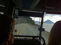 Der Highway klebt foermlich an den steil aufragenden Bergmassiv links, wohingegen es rechts steil ins Wasser runtergeht. Oeffnet man den Blick ueber das Wasser weiter nach rechts, so sieht man wieder Berge aus dem Wasser aufragen. Die Sonne glitzert im Pazifik, die Schleier- und Cumulus Wolken schmiegen sich an die schneebedeckten Berggipfel links und rechts vom Wasser. Gegen die Ausmaße muss man sich einfach nur klein fuehlen. Wildes Kanada. Wunderschoen. Ich freu mich darauf selbst in eigenem Wagen weiter rein zu fahren.