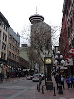 Jetzt geht es aber zuerst mal nach Downtown Vancouver. Ein Glaspalast ohne Ende. Ein glaesernes Hochhaus am naechsten, vollbetoniert, laut, viel Verkehr - auf und neben der Strasse. Ne Mischung aus New York (weniger hoch) und Sao Paolo (weniger warm).