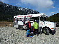 Los gehts Richtung Heliport. Witzig: alle sprechen deutsch. Mitten in Kanada komm ich mir vor wie irgendwo in Österreich. Jerome - ebenfalls in deutsch - plaudert mit. Der Bursche hat wohl ein paar Kinderjahre bei Frankfurt gelebt, hat ne französische Mutter und lebt und arbeitet seit mehr als 8 Jahren hier in Whistler. Wechselweise bei der Bergwacht und als Heliskiguide.