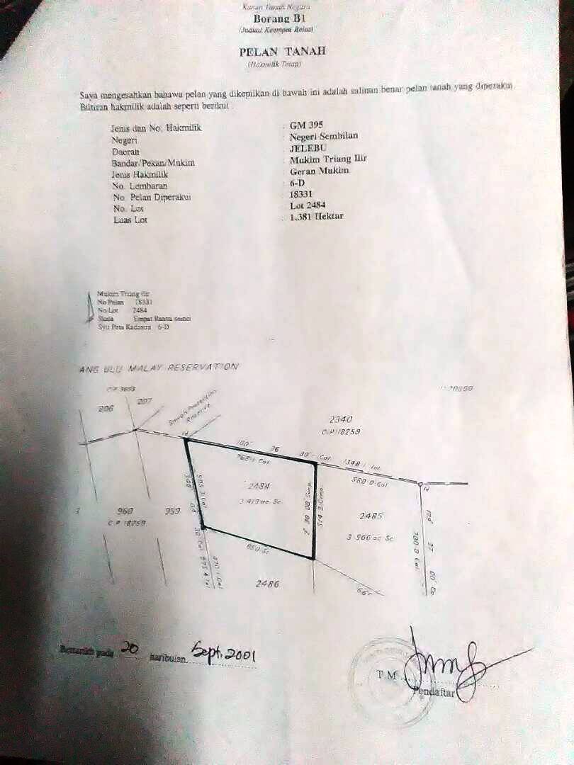 Saiz adalah 3.4 Ekar (1.381 Hektar). Lokasi di Juntai 1, Mukim Triang Ilir, Jelebu. Tanah kebun getah dan telah di bersihkan kawasannya. Tanah sedikit beralun tetapi tidak berbukit tinggi. Pegagangan bebas Rizab Melayu (untuk pembeli Melayu sahaja). Harga tawaran lum sum pada RM180K dirunding. Pembelian secara tunai akan dapat rebet istimewa dari pemilik. Kalau pinjaman bank, kena bayar 50% deposit dulu yer.. Untuk meninjau lokasi, kita perlukan Pacuan 4 Roda. Pembeli kena sediakan Pacuan 4 Roda sebab kami tidak miliki kenderaan tsbt. Sila tetapkan temujanji seawal 3 hari sebelum site visit. En Putra REN00201 IEC Properties 012-2615337 (panggilan & telegram) 010-3056823 (panggilan & whatsapp) Terima kasih.