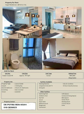 A luxury Condo made for Elite Livings & Lifestyle High Floor Unit at Level 49 of Tower A Corner unit 797sf built up Fully Furnished unit 2 rooms 1 bathroom Complete with A/Conds, Washing machine, Living Room Set with TV Dining set complete Gated with 24 hours Security Services 1 Parking Bay available for Tenant's Car Other indoor Facilities Provided Swimming Pool Children's Pool Dip Pool Jacuzzi Steam Bath Reflective Pond Playground Cafe (Space) Common Dining (Space) BBQ (Space) Game Room Meeting Room Function Room Surau ~etc~ Rental asked by owner is at RM 3,800 per month. Term 2 + 1 + 50% utilities. Agreement made for 1 year fixex & 1 year optional Call for View appointment thru:- En Putra REN 00201 IEC Properties 012-2615337 (call only) 010-3056823 (call @ whatsapp) Thank you.