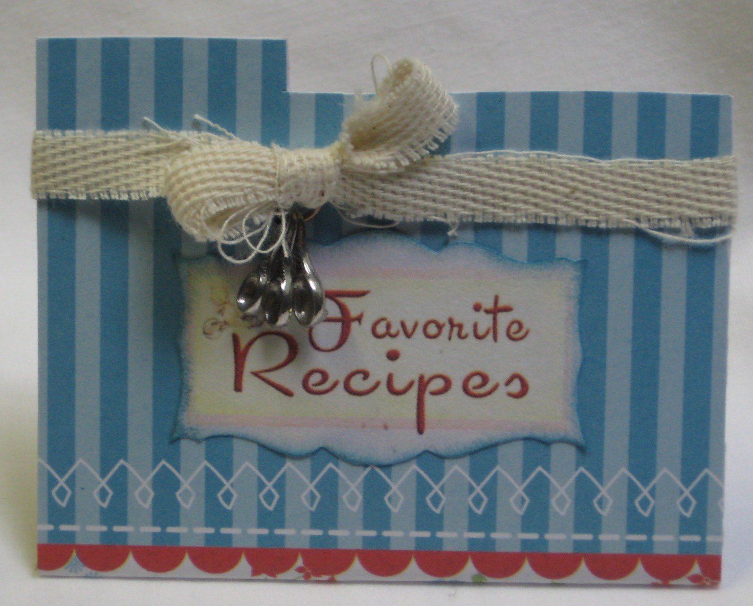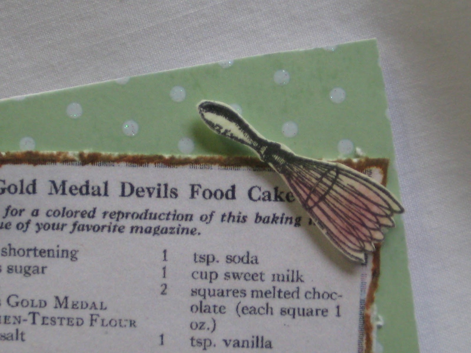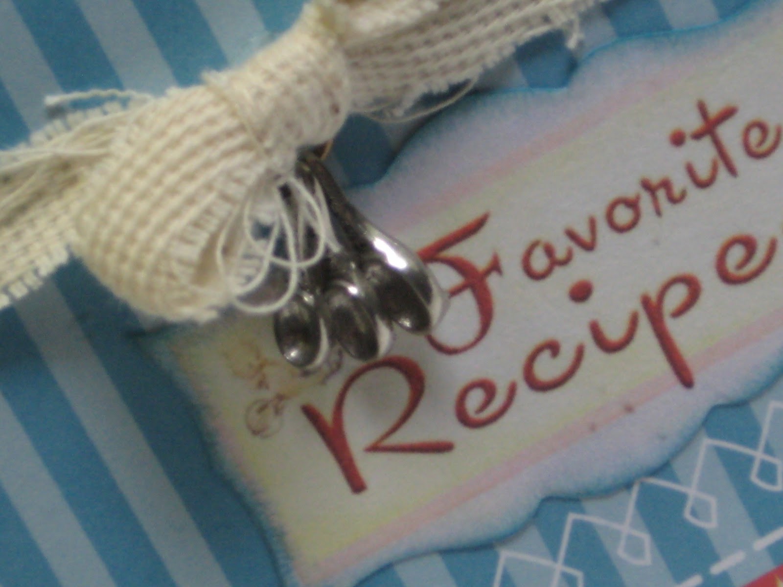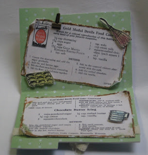 Crafty Secrets and I resized and printed an old recipe card I found at an antique shop in Maine several years ago. The papers came in a paper pack but I can't at the moment remember the company name and they're in Florida. The 3 1/2" by 2 1/2" card opens like a little file folder. Don't you just love the little measuring spoons from