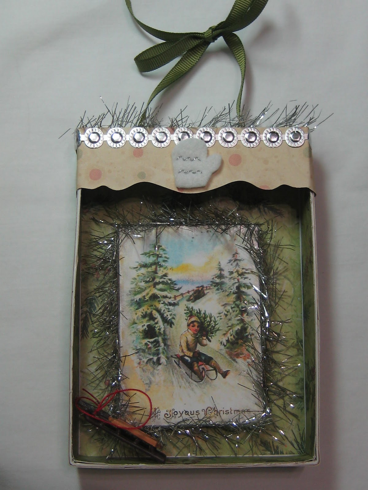 Several of my crafty friends and I started a little swap group called "Eclectic Paper Artists." Every month the hostess decides what we are to use to create a little project. This month I sent everyone a 5 x 3 jewelry-type box to make a Christmas/holiday collage to send to each member. I love making these little dioramas! I originally got the idea from Chris and Sharon at