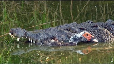 Ad un tratto la paura scompare e il cuore smette di battere all'impazzata. L'anatra attende ora serena la sua fine. Le fauci del coccodrillo si chiudono sopra il suo corpo facendo scricchiolare le ossa del torace. L'anatra percepisce un'ultimo scoppio proveniente dai suoi polmoni. Non c'è dolore. Poi tutto rotea e l'anatra si ritrova incorporea libera nel cielo, mentre il coccodrillo divora ciò che rimane del suo corpo.