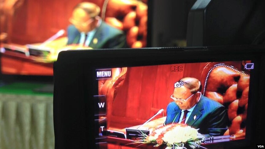 នៅក្នុងរូបថតពីអេក្រង់ទូរទស្សន៍នៅមន្ទីរដ្ឋសភានេះ លោក ហេង សំរិន ប្រធានរដ្ឋសភាជាតិ នៅក្នុងសម័យប្រជុំអនុម័តច្បាប់អង្គការកាលពីថ្ងៃច័ន្ទ ទី១៣ ខែកក្កដា ឆ្នាំ២០១៥។ (នៅ វណ្ណារិន/VOA)