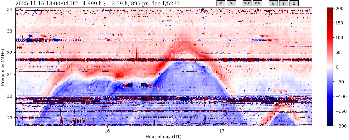 The receiver has not shown the sensitivity at HF and VHF frequencies of the SDRPlay and the rx888mk2 receivers that I have worked with. Even with the front-end modification, it cannot see scintillation of Cas A and Cyg A, or the variation of the galactic background as the galactic plane crosses the sky. It is best for seeing solar and Jovian emission.