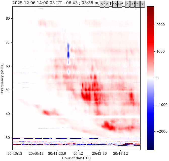 I posted a new spectroscopic code, lms2fits, to SourceForge for capturing dynamic spectra. It uses the LimeSDR-USB board, which is a dual-channel transceiver, having a USB3 chip that allows capture of up to 61 MSps of complex samples in two channels. These channels are intended to be X and Y polarization, which are processed to the four Stokes parameters and streamed to three-axis FITS files. The analog signal chain performs down conversion, allowing reception of frequencies up to 3.8 GHz. So it is suited to reception of Jovian decametric emission below 40 MHz, and solar emission over a wide range of frequencies. I have been running the receiver for several months at frequencies below 85 MHz, capturing the entire 60 MHz span for solar observing during the day, and from 14 to 38 MHz for Jovian emission during the night while Jupiter is currently high.