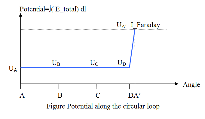 Faraday’s law defines how a varying magnetic field creates electric field. For the potential to be nonzero, EF must be nonzero. However, if we look at the electric field inside the conductor, it is not so. According to an electrostatic law, the force on the free electron must be zero; otherwise, the distribution of free electrons will change so that the electric field on the free electron becomes zero. On the surface, the electric field Es must be perpendicular to the surface. Considering such electric field in conductor, the potential between the point A and D is zero.