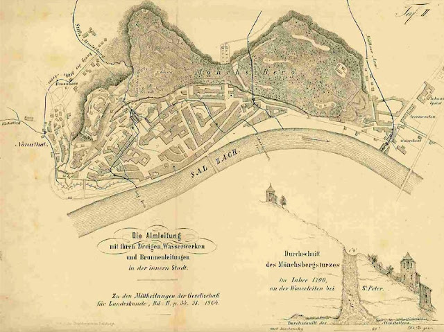 From these sites we learn that the Almkanal is a water channel (the oldest subterranean aqueduct) that flows from the Königsseeche (a large river that in the Alps) and then straight through a tunnel in the Mönchsberg (a ridge of stone running east-west on the southern edge of the town), "reaching the old town between the cemetery of St. Peter and the fortified lane..."