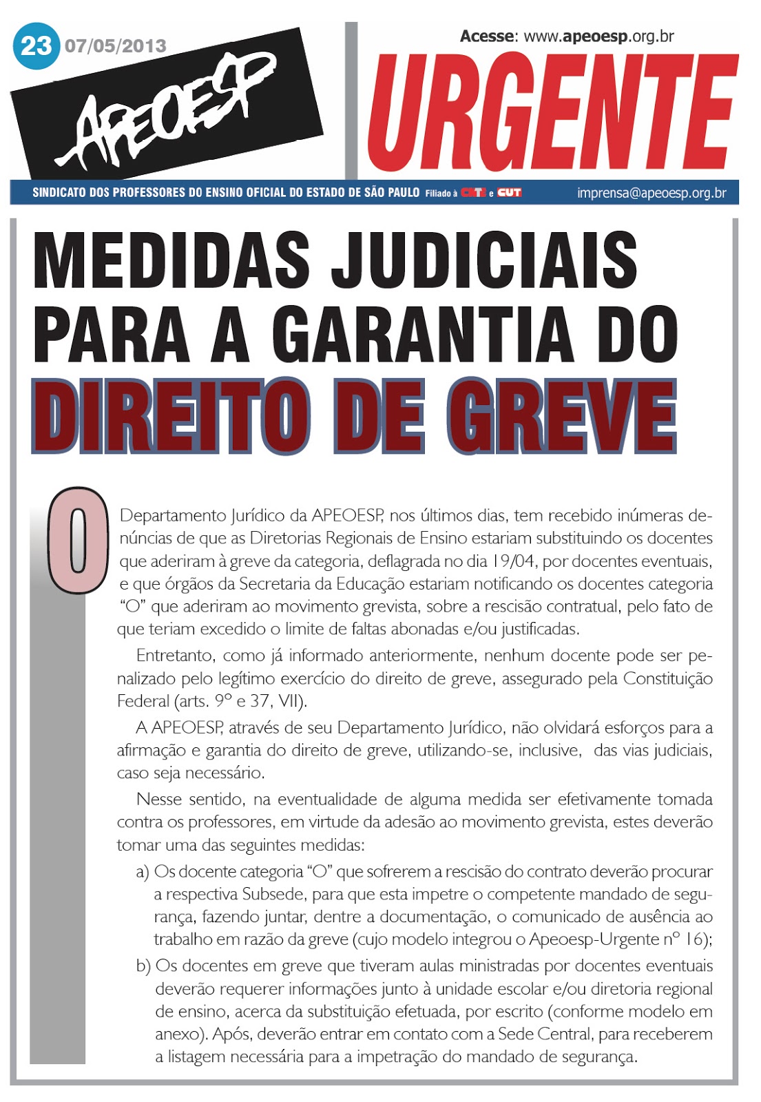 [APEOESP - Santo AMARO] Atenção Professores! - APEOESP Urgente N° 23 - Medidas judiciais para a garantia do direito de greve