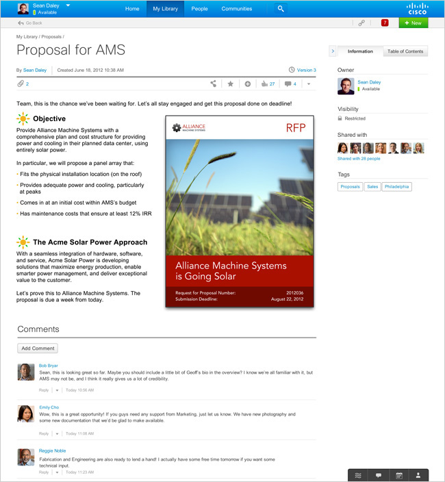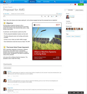 Cisco WebEx Social可以結合利用既有的網頁檔案管理系統,例如,Microsoft SharePoint,來作為文件檔案的儲存管理。 Cisco WebEx Social有兩種佈署的型態。 [Cloud: Cisco WebEx Social Service] 是的,不需要自己投資伺服器等基礎建設,購買帳號授權後就可以開始使用。所有的服務內容,都是透過Internet連線到Cisco自己的數據中心,是一個標準的雲端運算的場景。 不過,這種場景,比較適合小規模佈署,例如,1,000人以下。 [In-house Server: Cisco WebEx Social Server] 需要部署自己的伺服器後,安裝WebEx Social Server軟體。只要硬體資源足夠,可以支援1,000人以上甚至到數萬人。 [結論] Cisco WebEx Social 可以讓員工在內部的網頁上,就可以開始工作,使用Cisco自己的通訊、會議等系統。同時,也可以讓員工在例如iPhone/iPad上面在任何時間和任何地點工作,相較於傳統只有Email系統的情境,員工的生產力將會大幅提升。