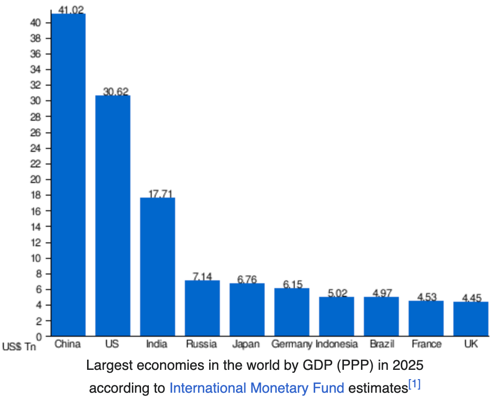 But one should really look at GDP while accounting for Purchasing Power Parity (PPP), which takes into account cost of living and other variables. Once you do that, it becomes head-smackingly clear that China is lapping the US — $41 trillion compared to $30 trillion.