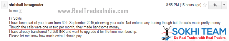 ** Click here to Enlarge. [ Hi Sokhi, I have been part of your team from 30th September 2015,observing your calls. Not entered any trading though but the calls made pretty money. Though the calls were one or two per month, they made handsome money. I have already transferred 18,350 INR and want to upgrade it for life time membership. Please let me know how much extra I should pay ]