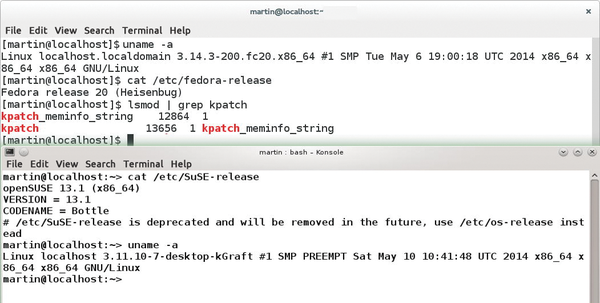 The following instructions show how to run kGraft on openSUSE 13.1 and Kpatch on Fedora 20 with quite new kernels (Figure 1). Although you could follow these instructions for other distributions, you might find that the installation overhead is considerably greater.