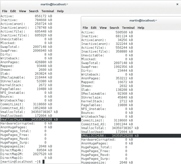 $ diff -ruN orig/fs/proc/meminfo.c new/fs/proc/meminfo.c --- orig/fs/proc/meminfo.c 2014-03-31 05:40:15.000000000 +0200 +++ new/fs/proc/meminfo.c 2014-05-11 16:33:19.148771809 +0200 @@ -131,7 +131,7 @@ "Committed_AS: %8lu kB\n" "VmallocTotal: %8lu kB\n" "VmallocUsed: %8lu kB\n" - "VmallocChunk: %8lu kB\n" + "VMALLOCCHUNK: %8lu kB\n" #ifdef CONFIG_MEMORY_FAILURE "HardwareCorrupted: %5lu kB\n" #endif