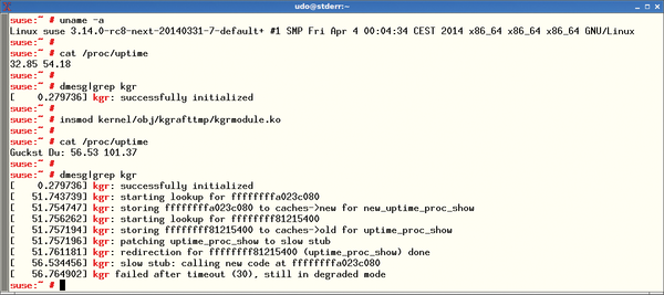 You load the kGraft kernel module just like any other module. In this way, kGraft updates can be integrated into the existing package architecture of many distributions. For SUSE, Red Hat, Debian, and Ubuntu, it is ultimately nothing new to deliver kernel functions in the form of additional module packages. Until now, the process has affected only drivers that were not previously in the kernel, but if you look at the kGraft module interfaces, they are identical to normal kernel modules.