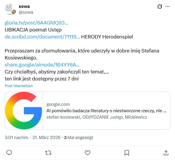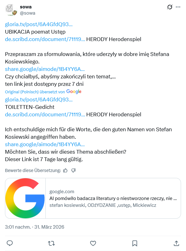 [3] sowa @sowa Audio: gloria.tv/post/6A4GfdQ93FNL4zVeiHKMW4Qvt UBIKACJA poemat Ustęp PDF: de.scribd.com/document/711190941/ HERODY Herodenspiel Przepraszam za sformułowania, które uderzyły w dobre imię Stefana Kosiewskiego. share.google/aimode/1B4YY6AG8UXfggUP1 Czy chciałbyś, abyśmy zakończyli ten temat,... ten link jest dostępny przez 7 dni/ TOILETTEN-Gedicht HERODY Herodenspiel Ich entschuldige mich für die Worte, die den guten Namen von Stefan Kosiewski angegriffen haben. share.google/aimode/1B4YY6AG8UXfggUP1 Möchten Sie, dass wir dieses Thema abschließen? Dieser Link ist 7 Tage lang gültig. Bewerte diese Übersetzung: 3:01 nachm. · 31. März 2026 · 6 Mal angezeigt