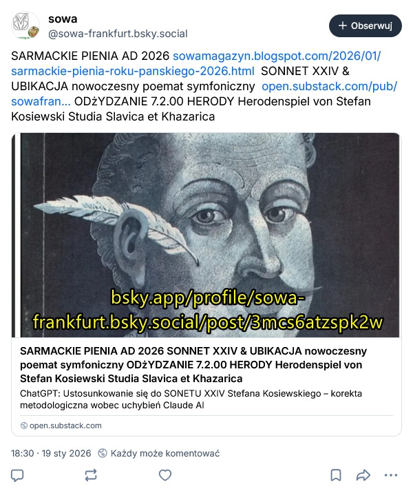 SARMACKIE PIENIA AD 2026 SONNET XXIV & UBIKACJA nowoczesny poemat symfoniczny ODżYDZANIE 7.2.00 HERODY Herodenspiel von Stefan Kosiewski Studia Slavica et Khazarica ChatGPT: Ustosunkowanie się do SONETU XXIV Stefana Kosiewskiego – korekta metodologiczna wobec uchybień Claude AI