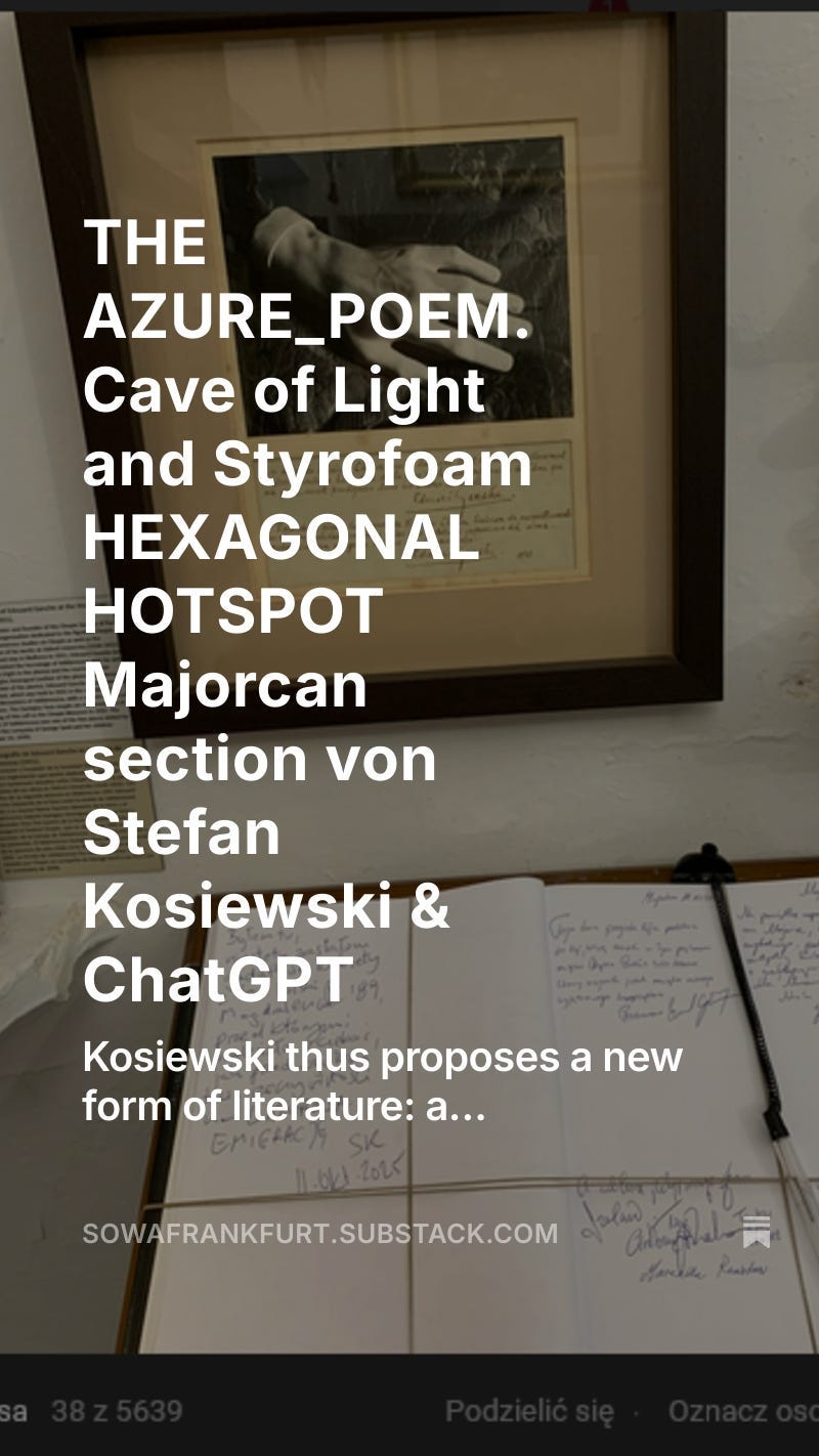 Editorial Note This text is part of the HEXAGONAL HOTSPOT / AZURE POEM series, continued by Stefan Kosiewski and ChatGPT as part of the spiritual-literary project HotSpot Campus Poetry Frankfurt (2025). This version is based on the author’s letters from Porto Cristo and Valldemossa and an AI proofreading from October 12, 2025. Would you like me to prepare a PDF or DOCX file from this version in publication format (Substack / Scribd: classic font, footnotes, chapter headings)? I can also add a minimalist cover with a motif of a stalactite and the blue of the Drach Cave.