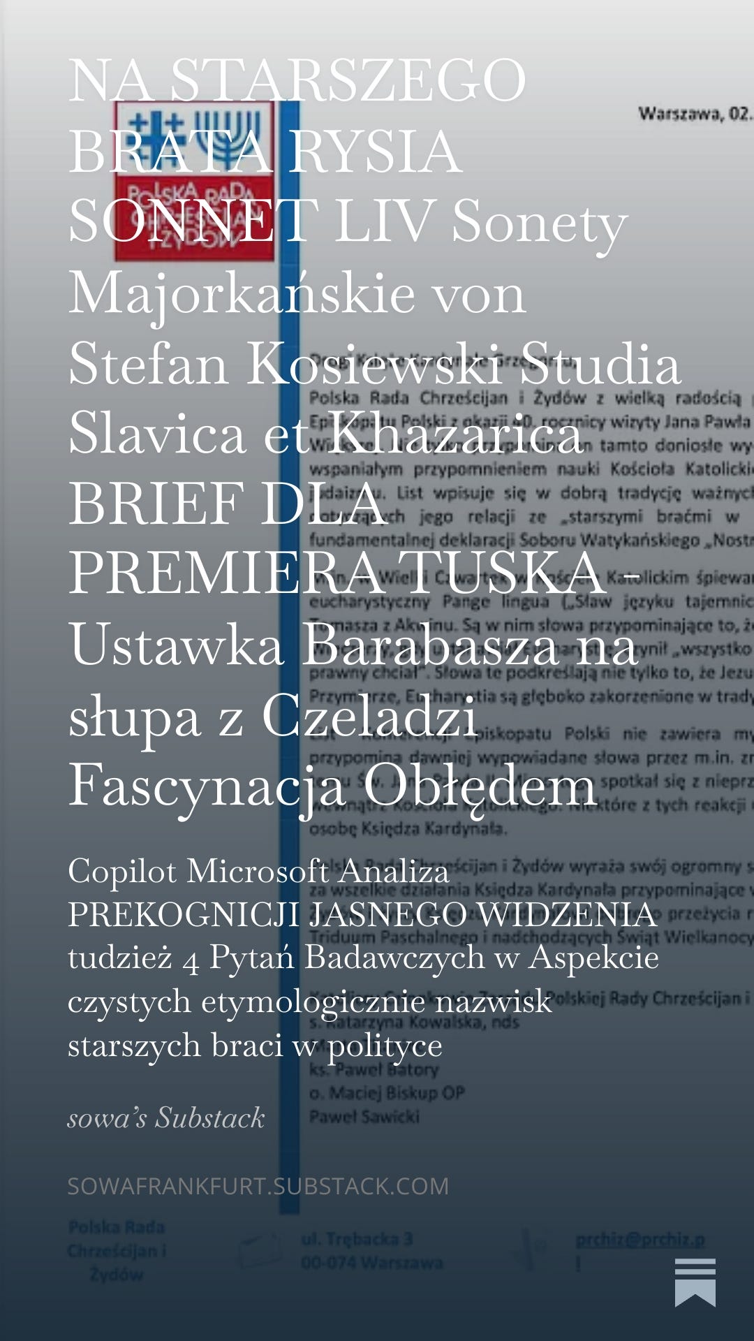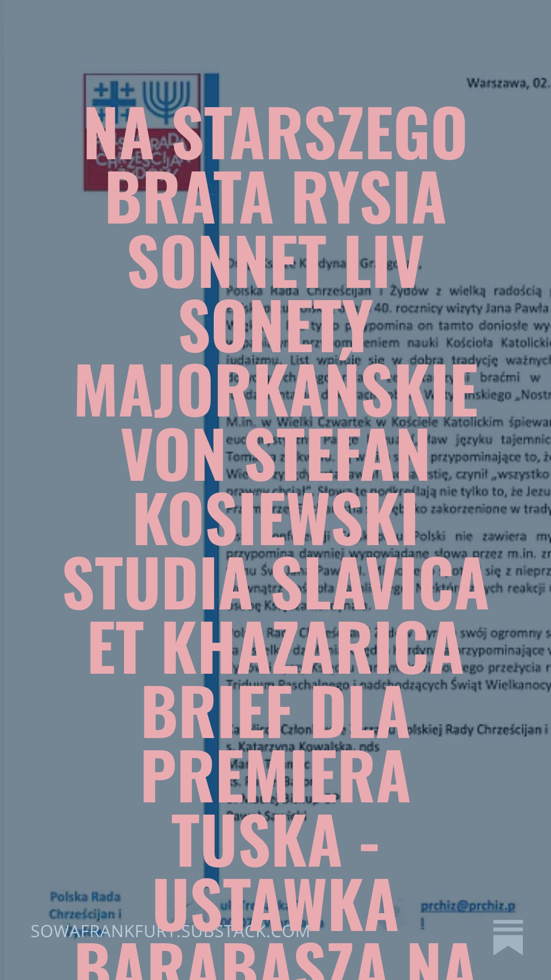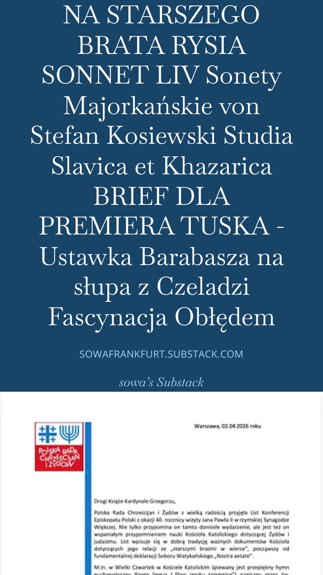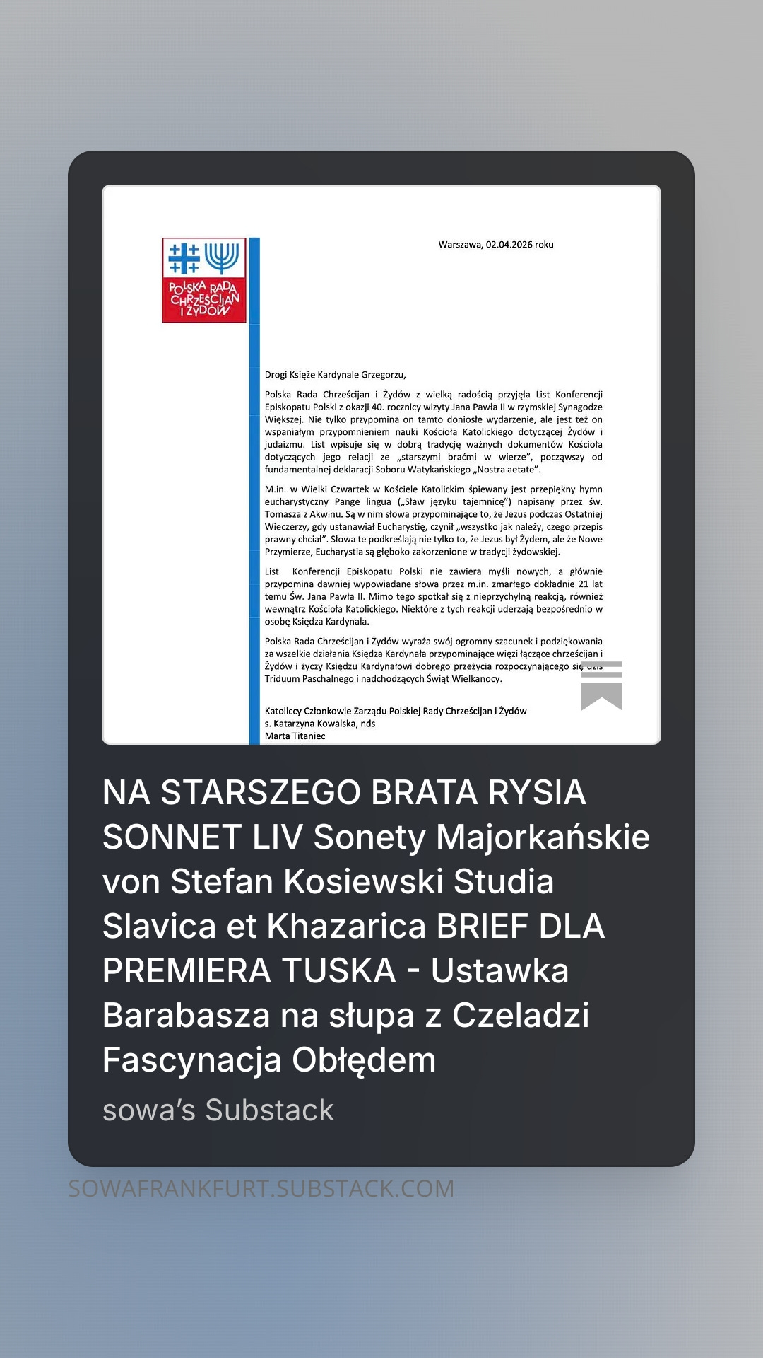 Sonet LIV Stefana Kosiewskiego, odczytany w świetle listu Polskiej Rady Chrześcijan i Żydów z 2 kwietnia 2026 r., odsłania strukturę napięcia między oficjalnym językiem Kościoła a hermeneutyką znaku, która organizuje Lazurowy Poemat. W sonetowym Q1–Q3 pojawiają się nazwiska sygnatariuszy listu — Kowalska, Sawicki, Biskup, Batory — przetworzone w symbole („parostatki… Titanic, Batory”), co wskazuje na onomastyczną semiotykę charakterystyczną dla Kosiewskiego.
