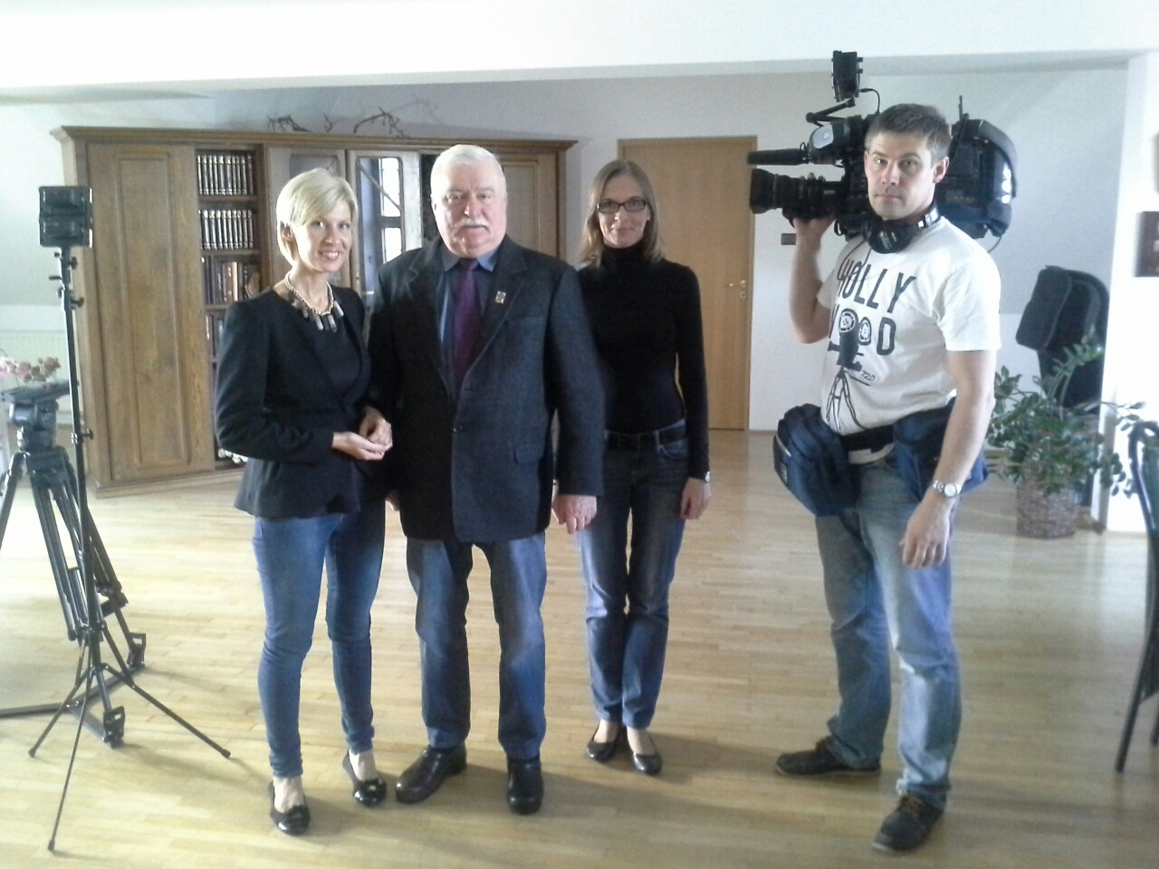 konferencji prasowej w gdańskim Dworze Artusa w pierwszym rzędzie pustej za nim sali siedzi Lech Wałęsa, obok stoi wsparta na kulach Janina Ochojska, a z drugiej strony Wałęsy zasiada Jan Krzysztof Bielecki, mniejszy od Wałęsy o pół głowy a podobny do Jarosława