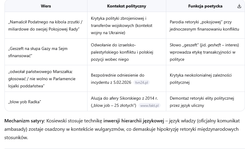 a) Poziom powierzchniowy: Satyra polityczna na incydent z 5.02.2026 b) Poziom filozoficzny: Refleksja o naturze czasu i bólu w erze politycznej natychmiastowości c) Poziom meta-poetycki: Diagnoza niemożliwości poezji w świecie, gdzie język został zawłaszczony przez imperium