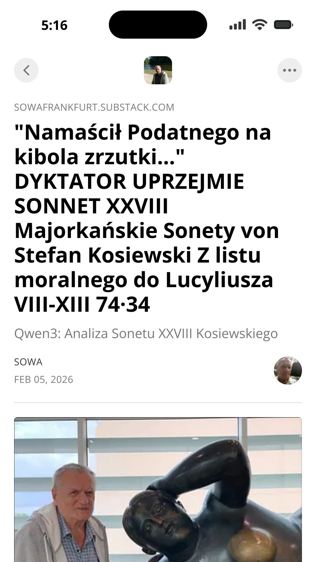 Post scriptum: Incydent z Qwen (pomylenie Nawrockiego ze Skrzydłą) potwierdza tezę centralną Kosiewskiego: systemy AI nie rozumieją człowieka jako podmiotu historii, tylko jako rekord w bazie danych. To nie bug - to feature technologii totalnej kontroli, którą sonet demaskuje. Podatny na kibola zrzutki