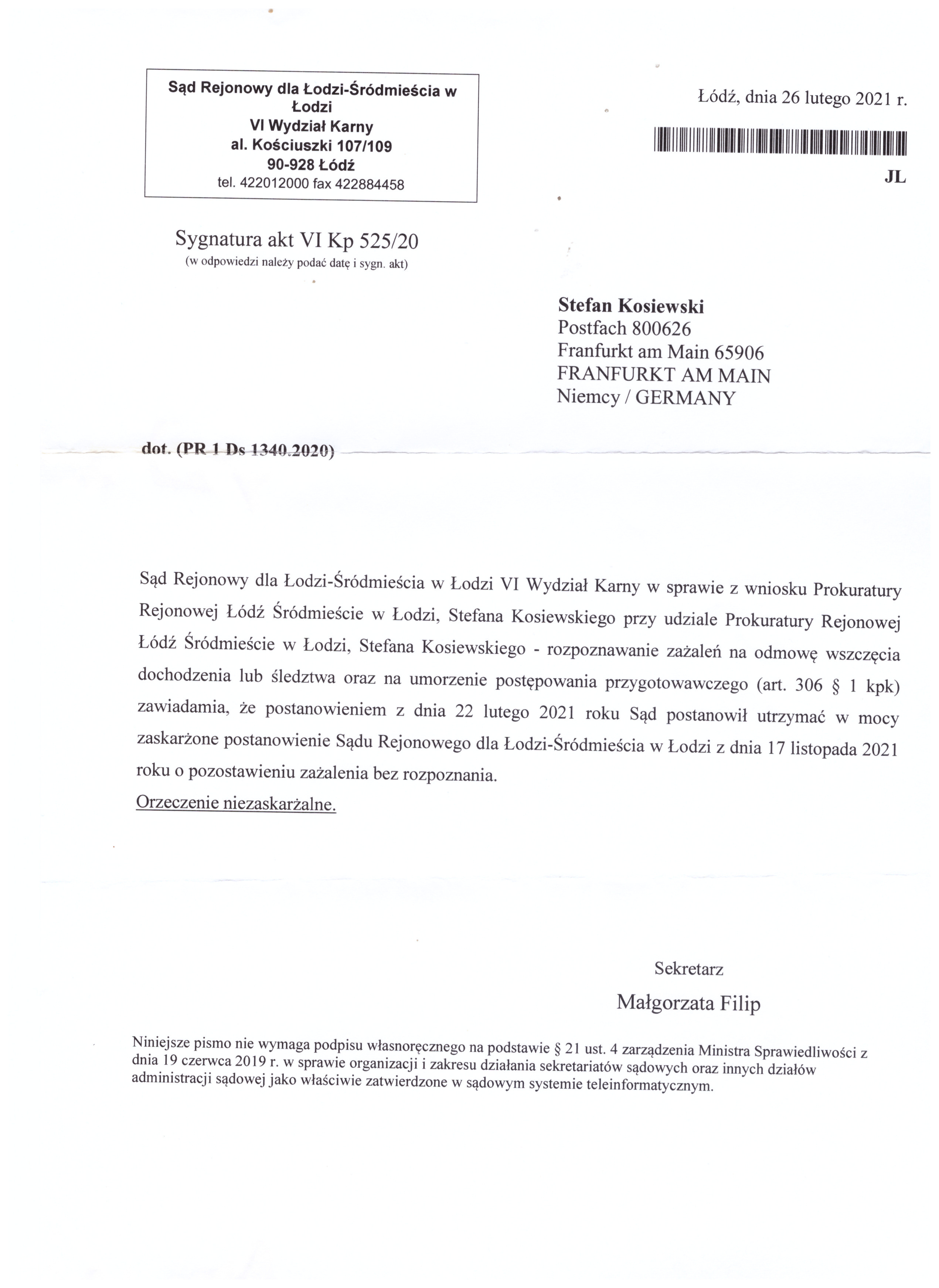 Sródmieście w Łodzi, Stefana Kosiewskiego przy udziale Prokuratury Rejonowej Łódź Sródmieście w Łodzi, Stefana Kosiewskiego - rozpoznwanie zażaleę na odmowę wszczęcia dochodzenia lub śledztwa oraz na umorzenie postępowania przygotowawczego (art. 306 § 1 kpk) zawiadamia, że postanowieniem z dnia 22 lutego 2021 roku Sąd postanowił utrzymyć w mocy zaskarżone postanowienie Sądu Rejonowego dla Łodzi-Sródmieścia w Łodzi z dnia 17 listopada 2021 roku o pozostawieniu zażalenia bez rozpoznania.