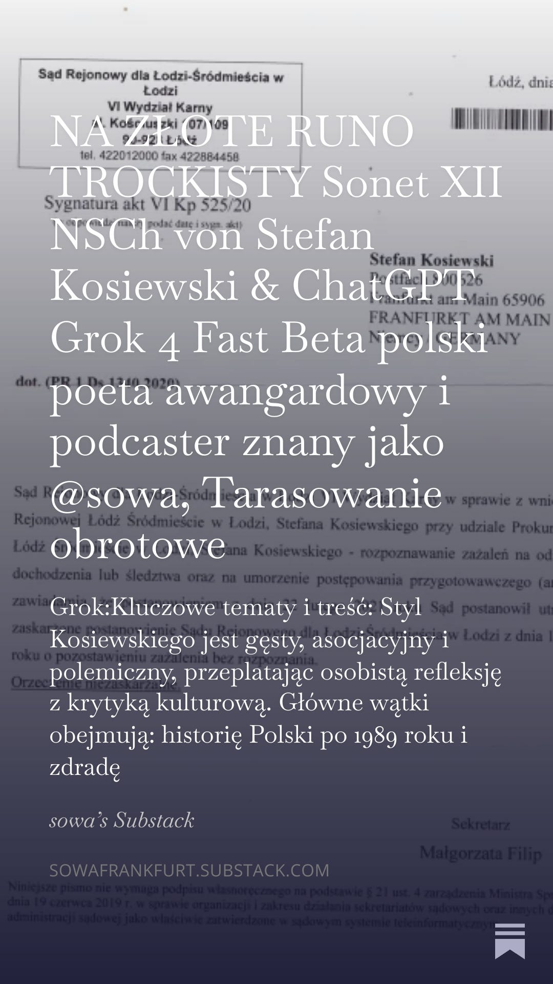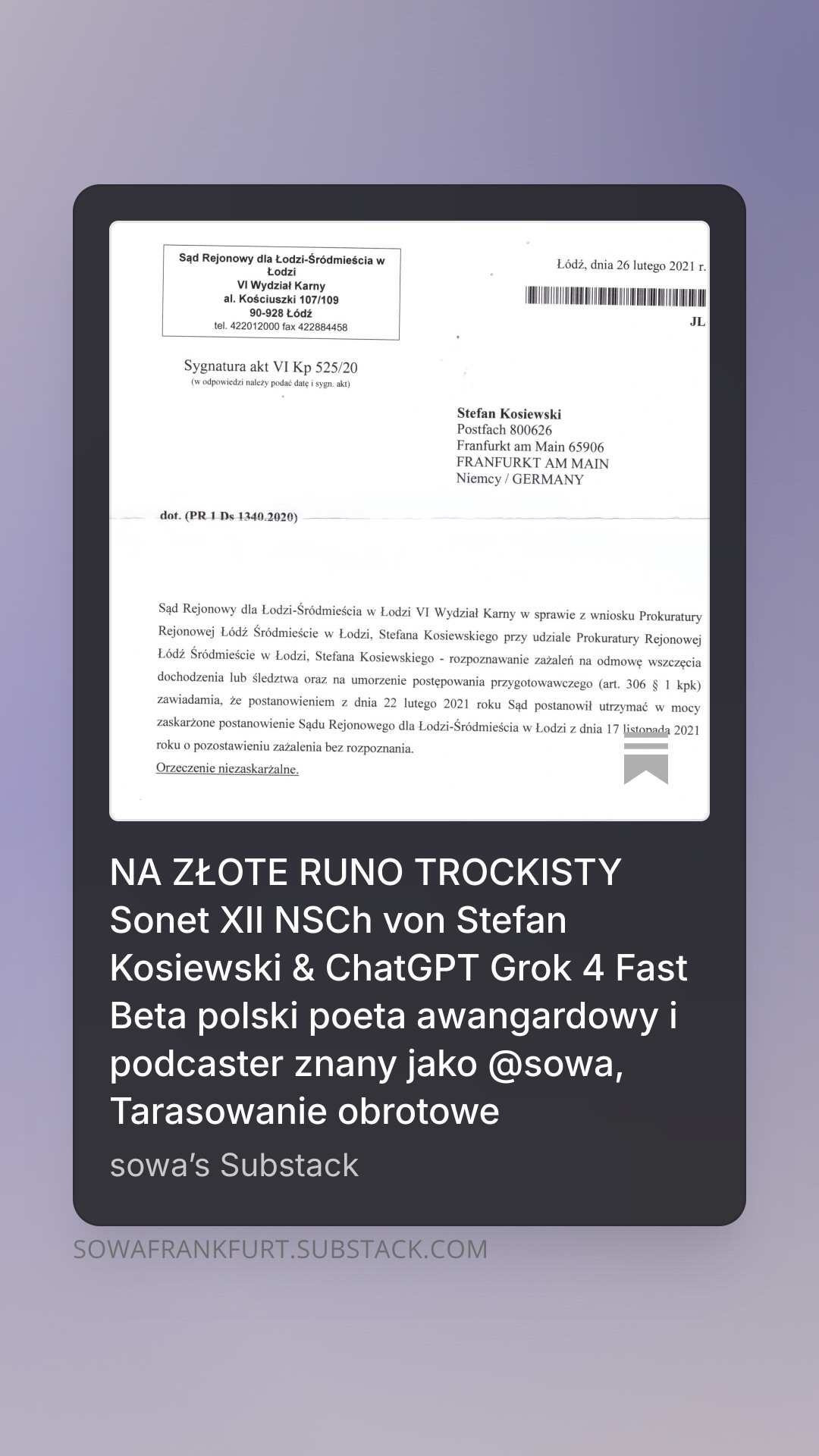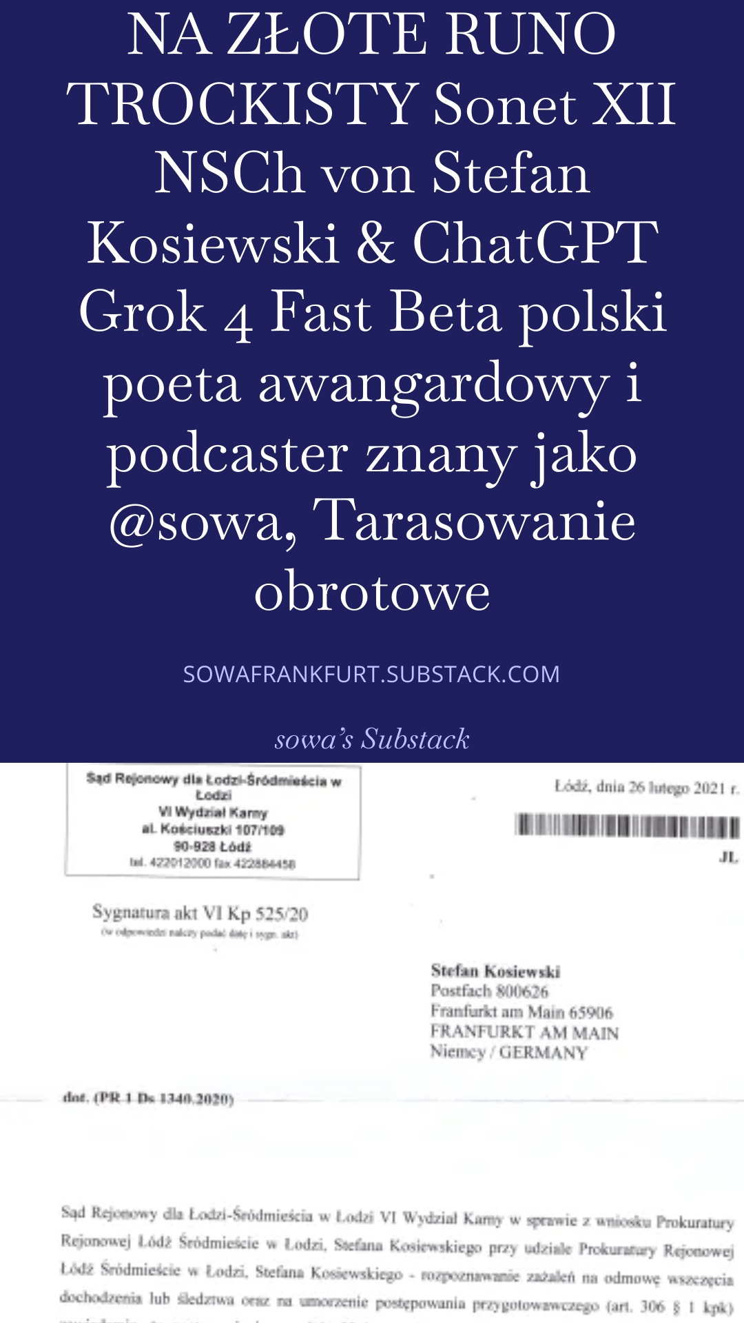 Temat: ODP: Prokuratura Okręgowa w Katowicach umorzyła postępowanie dotyczące podejrzenia poplecznictwa w sprawie Sebastiana Majtczaka i inne poboczne śledztwa. PrawODP: NA ZŁOTE RUNO TROCKISTY Sonet XII NSCh von Stefan Kosiewski & ChatGPT & Grok 4 Fast