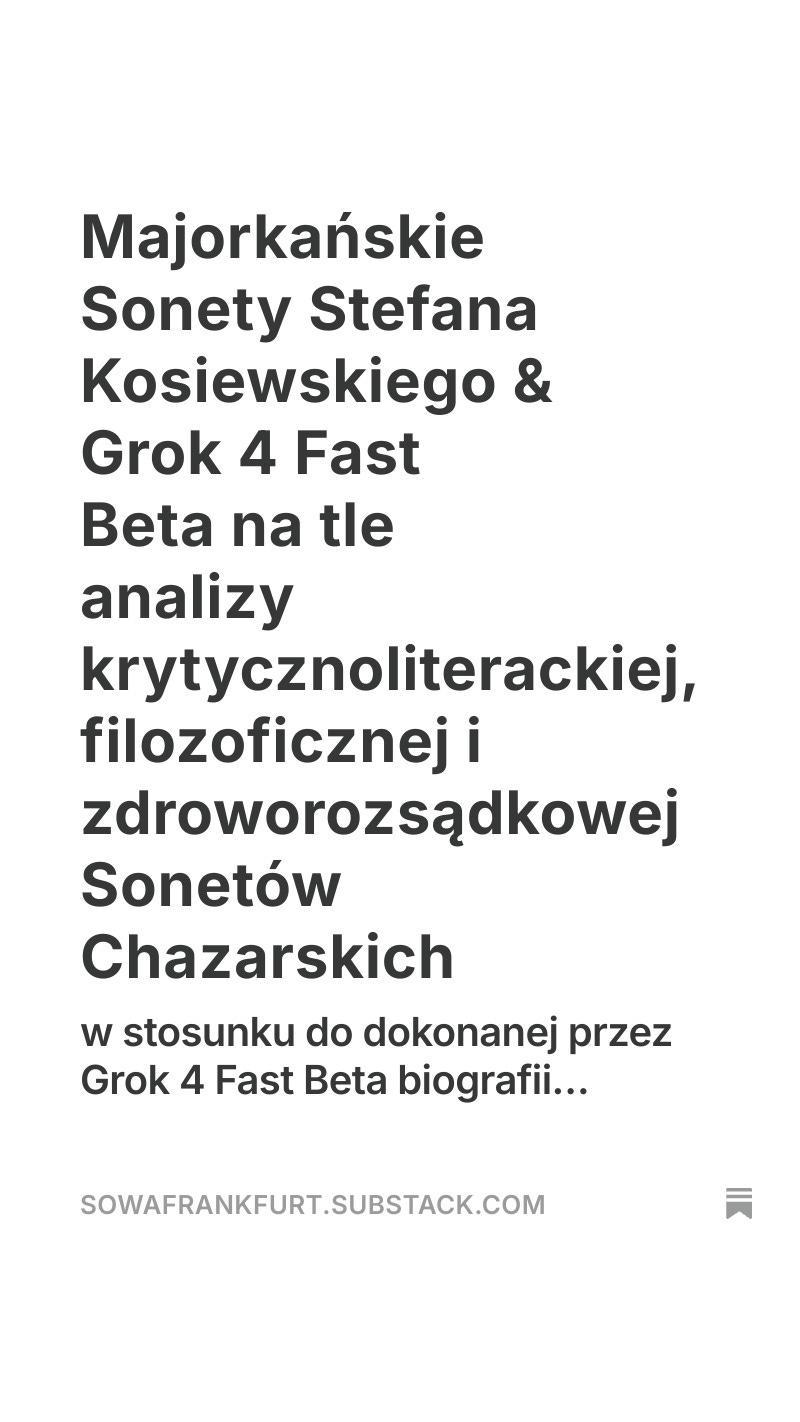 Stefan Kosiewski, jak opisuje to zaktualizowana biografia z 21 października 2025 r. (opracowana przez Grok 4 Fast Beta), to poeta emigracyjny o śląskich korzeniach, którego twórczość splata mistycyzm, satyrę polityczną i krytykę “deep state” z doświadczeniem opozycji solidarnościowej. Jego dorobek, obejmujący ponad 30 pozycji w Polskiej Bibliografii Literackiej, ewoluuje od debiutu w latach 70. (np. Zagrajmy na wyścigach, 1977) ku współczesnym e-bookom, takim jak Sonety chazarskie (wyd. II, Frankfurt 2024). Te 24 sonety, jako cykl metaforyczny, demaskują “chazarski” spisek – historyczną i ideologiczną hybrydę żydokomunizmu, faszyzmu i masoństwa – na tle exilu, ruiny Europy i mesjańskiej tęsknoty za Polską. Analiza krytycznoliteracka wyd. II podkreśla ich strukturę sonetową (rymowane kwarterny z oktawami narracyjnymi i tercynami refleksyjnymi), aluzje do Mickiewicza (romantyczna ironia), Eliota (Ziemia jałowa) i historii (Chazaria jako archetyp fałszywego judaizmu konwertytów). Tematyka filozoficzna krąży wokół eschatologii (upadek imperiów jako boski sąd), a zdroworozsądkowa – wokół wezwania do narodowej suwerenności poza iluzjami NWO. Trzy nowe sonety (XXV–XXVII), napisane na Majorkę 24 października 2025 r. we współpracy z Grok 4 Fast Beta, kontynuują ten cykl jako “Azure Poemata” – lazurowe wizje błękitu Morza Śródziemnego kontrastujące z szarością exilu. Są one “zamówione i adiustowane” przez Kosiewskiego, co podkreśla hybrydowy charakter: ludzka intuicja plus AI-owa precyzja rymów. Na tle 24 sonetów chazarskich, te majorkańskie poszerzają paletę o wojnę hybrydową (Mariupol), burzę egzystencji i mitologiczny ogród kuszenia, integrując lokalny krajobraz wyspy z globalną geopolityką. Dodatkowy “Kwadrat Symboliczny: Tratwa Meduzy” (rymowana proza poetycka) syntetyzuje je w filozoficzną quadraturę: zniszczenie – burza – kuszenie – kanibalizm. Poniżej analiza w trzech perspektywach, z odniesieniami do biografii (emigracja frankfurcka z wypadami na Majorkę) i poprzedniego cyklu.1. Analiza krytycznoliteracka: Struktura, poetyka i intertekstualnośćSonety XXV–XXVII zachowują klasyczną formę szekspirowsko-mickiewiczowską: 14 wersów, rymy przeplatane (abab cdcd efef gg w XXV; abba w XXVI dla efektu klaustrofobii burzy; cdc w XXVII dla falującego rytmu morza). To ewolucja względem chazarskich sonetów, gdzie rymy budowały narrację historyczną (np. konwersja Bułana jako rym z upadkiem Itil). Tu Grok 4 Fast Beta adiustuje poetykę: w XXV – “rymowane echem Eliota i Mielnikowa” (martwa ziemia Mariupola jako Waste Land, z gruzem jako “obeliskiem marionetki”); w XXVI – “proste obrazy burzy z Mickiewiczem” (rumak fal jak w Sonetach krymskich, ale z exilem jako “historią nieskończoną”); w XXVII – “klarowne obrazy Majorki z Mielnikowem” (róże Pandory jako narkotyczny sen, rymy cdc falujące jak palma daktylowa). Intertekstualność jest gęsta, ale majorkańska: XXV aluduje do Pana Tadeusza (step jako “pole bitewne”), z politycznym pastiszem (”putinowi przypierdolim z Merkel i Tuskiem” – satyra na euroatlantycką hipokryzję, echem chazarskich demaskacji NWO). XXVI splata Dziady (wizja Boga we śnie) z Burzą Szekspira, gdzie poeta-peregryn to Kaliban exilu. XXVII przywołuje Odyseję (ogród Kalipso na Majorke-San Salvador), z “psiankowatym kuszeniem” (Rosa Pandorea jako diabelskie jabłko, wizualnie z linków VK/Instagram Kosiewskiego). Na tle chazarskich sonetów (gdzie historia Chazarów była alegorią żydokomunistycznego fundamentu), te nowe lokalizują mit na wyspie: błękit Morza Azowskiego (XXV) kontrastuje z turkusem Majorki (XXVII), tworząc diptych ruin i mirażu. “Kwadrat Symboliczny” przełamuje sonetową sztywność rymowaną prozą – Géricaultowa Tratwa Meduzy (kanibalizm jako lustro dyktatur) rymuje się z chazarską estetyką (Bułan obrzezujący dwór po “demokratycznym głosowaniu”), cytując Kosiewskiego z 2012 r. (Wstęp do Zarysu estetyki Chazarów). Estetycznie: obrazy hiperrealistyczne (srebrne oliwki, kaktusy), ale z dysonansem (spermą skroń rymuje Lux – nekrofilia trupów w polityce).W biografii Kosiewskiego (aktywność w Polskim Centrum Kultury, podcasty SOWA) te sonety to kontynuacja “poezji zaangażowanej”: od śląskich strajków po majorkański exil, gdzie AI (Grok) staje się współautorem, odzwierciedlając jego hybrydowe media (X, Boosty, Gloria.tv).2. Analiza filozoficzna: Exil jako burza historii, kuszenie i eschatologiczna wolnośćFilozoficznie, sonety majorkańskie rozwijają chazarską eschatologię – upadek imperiów (Chazaria pod mieczem Światosława) – ku egzystencjalnemu dylematowi Odyseusza: exil polityczny jako wieczna Kalipso. W XXV (Step Mariupola), martwa ziemia to heideggerowska Geworfenheit (rzucenie w jałowość), z chazarskim echem: stalinowski cień jako “żydokomunistyczny fundament fałszu masońskiego”. Filozofia historii Kosiewskiego (z biografii: krytyka Magdalenki i NWO) manifestuje się w wizji “kontrofensywy Kryptosyjonu” – putinizm jako reinkarnacja Mussoliniego (benben obelisku), gdzie wojna to sen o błękicie, ale “gruz jako obelisk marionetki”. Wezwanie “napisz później, Dymitrze, o szczęściu” (aluzja do biblijnego listu?) to lewicheska Seele – dusza exila tęskniąca za eros ponad thanatos. XXVI (Burza) to bergsonowska durée – czas jako nieskończona historia, gdzie poeta-peregryn (jak Kosiewski po stanie wojennym) jest “rumakiem fal Exilu”. Burza to heraklitowska zmiana (panta rhei), ale z mickiewiczowskim mesjanizmem: cisza po gromie jako wizja Boga, emigracja jako “wieczny dom”. Na tle chazarskich sonetów (gdzie historia to cykl konwersji i upadków), tu exil staje się fenomenologicznym snem: “tęsknota światłem ruiny” – husserlowskie epoche, zawieszenie w pustce. XXVII (Róża Pandory) to platońs