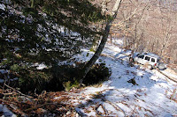 Nell’ordine: Catravasso I e II di Cesa Schiometta, due pozzi non profondi ma piuttosto larghi; L’Ouso a due bocche e alcuni Catravassi nella zona di Giulianello, che si trova sul versante del Semprevisa sotto la strada che sale da Pian della Faggeta, all’incirca sotto il complesso Enriquez. Tutti pozzi larghi (nelle foto si vedono alcuni dei Catravassi). Si nota anche il fuoristrada di Max che avanza nella neve…
