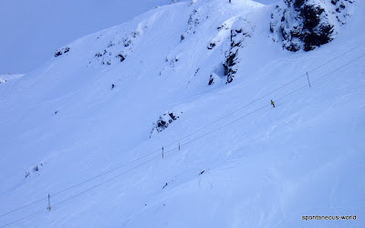 Hacemos una primera bajada. Y ahi va donde ya empiezo a hacer de las mias. Ben baja primero hasta despues del cambio de pendiente donde debia esperarnos aunque no nos pudiera ver. Yo sigo, una curva, dos curvas...tres, cuatro....y alli estrené mi "libro de caidas", y esta no estuvo mal. Suerte que la nieve era blandita ;-) 3 volteretas y los 2 esquis perdidos. Heather que bajaba después me bajo un esqui...pero aun faltaba uno. Asi que nada, a cavar, entre una pala y un esqui, levantamos toda la zona hasta que vimos unas trazas de frenos de los esquis que salian cuesta abajo. En efecto, 30 minutos despues, calzé un esquí y despacito llegué adonde se habia parado el otro.....