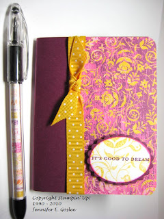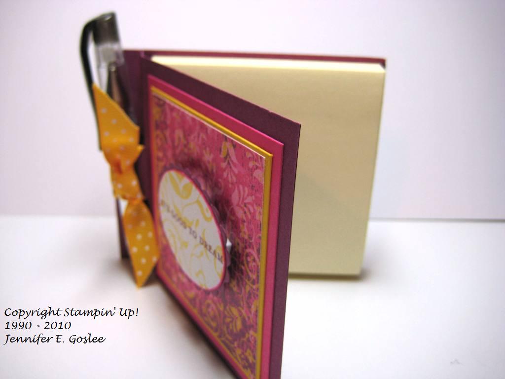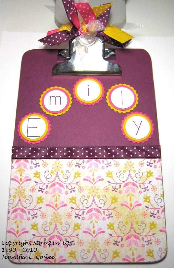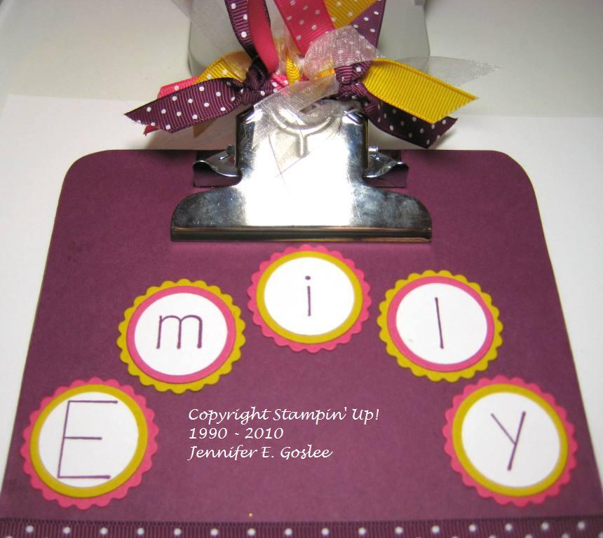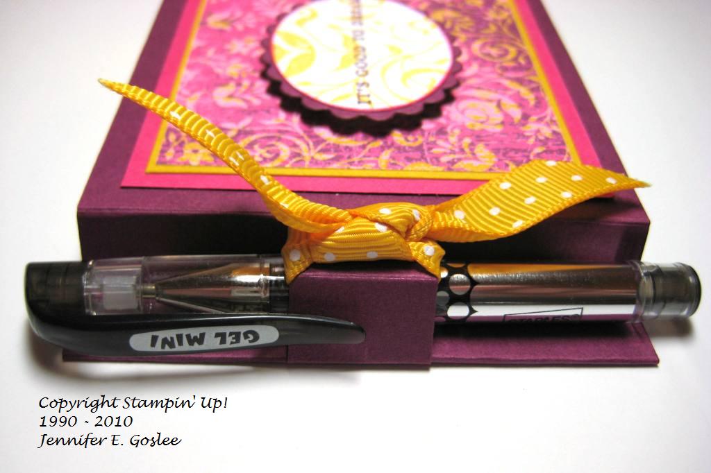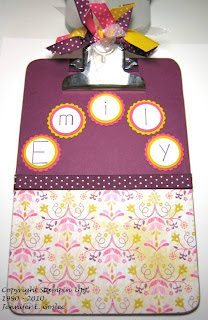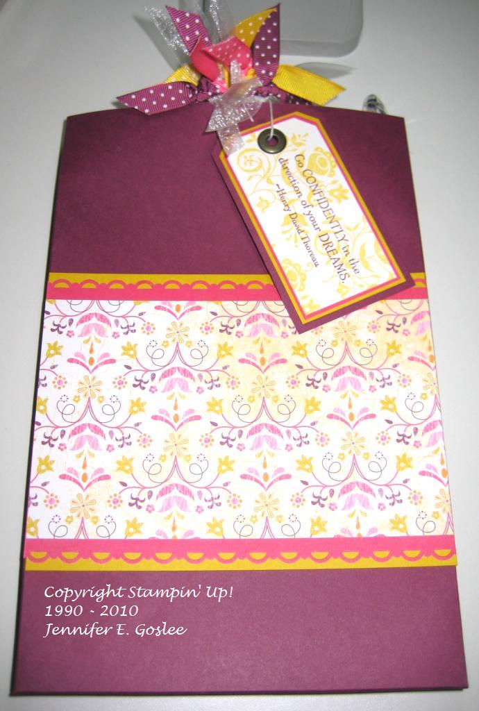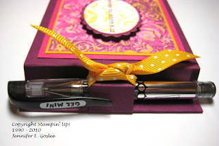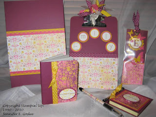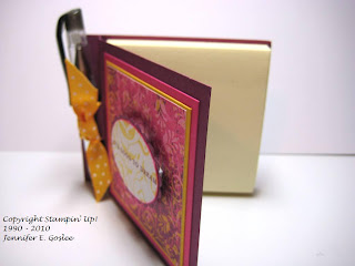 I also made this super cute gift set for her. It was made using the Razzleberry Designer Series Paper and coordinating cardstocks and inks. I was really pleased at how it all came together. The gift box was designed after I realized that I didn't have any gift bags, but I'm happy with the way it turned out. The ribbon at the top of the box/bag is actually attached to the clipboard. I made the box the same length as the clipboard so the ribbon would stick out just above the top. To view larger images, click on the photos.