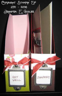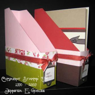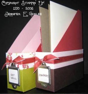 Over the years, I've made hundreds of cards. Unfortunately, they haven't all found homes yet and are just waiting to be sent to someone. Up until today they've been stored in a rubbermaid shoe box, in no particular order, and it always takes a while to find exactly what I'm looking for. Not anymore!! I made these mini magazine holders today that are the perfect size for a standard A2 card (5 1/2" X 4 1/4"). I used the "Bella Rose" DSP and coordinating cardstock. I've only got two of them completed, but plan to do several more so I'll have at least one for each card category. They're going to look just absolutely wondermous since they'll coordinate with the rest of my craft room decor!! Let me know what you think... I might have to schedule a class where we'll make these!