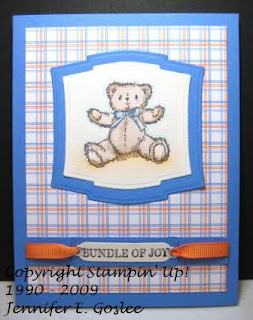 My sister-in-law, Tiffani, is in labor this evening and I'll soon have a new nephew. That news got me in the mood to make a baby card. I used the "Teddy & Train" stamp set and the "Pawsitively Prints" DSP with coordinating colors. The teddy bear image was stamped in Jet Black StazOn on SU Watercolor Paper and then watercolored using the SU markers. Hope you like the card. I'll be anxiously awaiting the news of his arrival!!