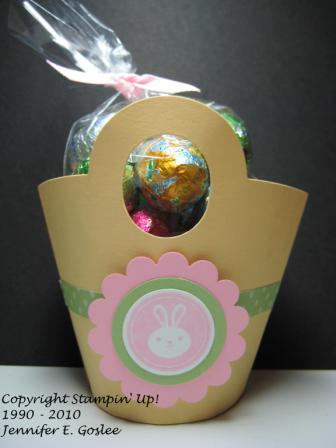 Check out these Easter treats that go together in a flash! I used the Baskets and Blooms Sizzix Bigz die to cut the pieces for my basket. I used sticky strip (acme strength adhesive) to put it together, stuffed some Easter treats in a cellophane bag, tied it with ribbon, and added a punched accent to the front... WAH-LAH!! Easter treats with some handmade flair... and everyone will think you went to SO much work!!