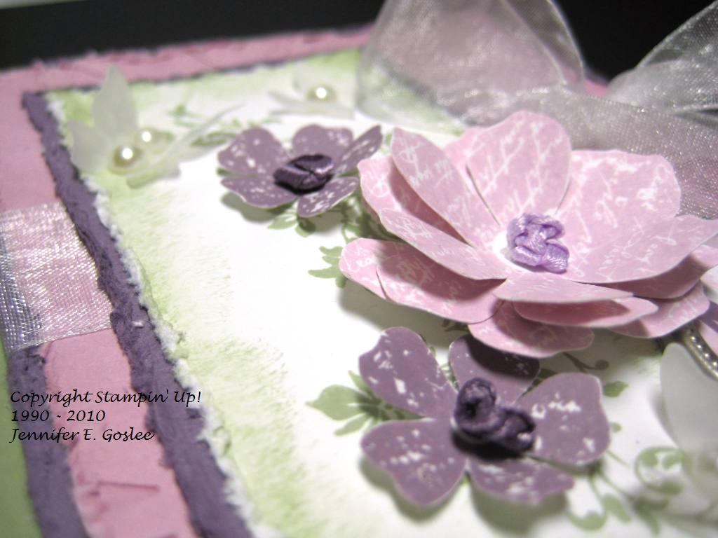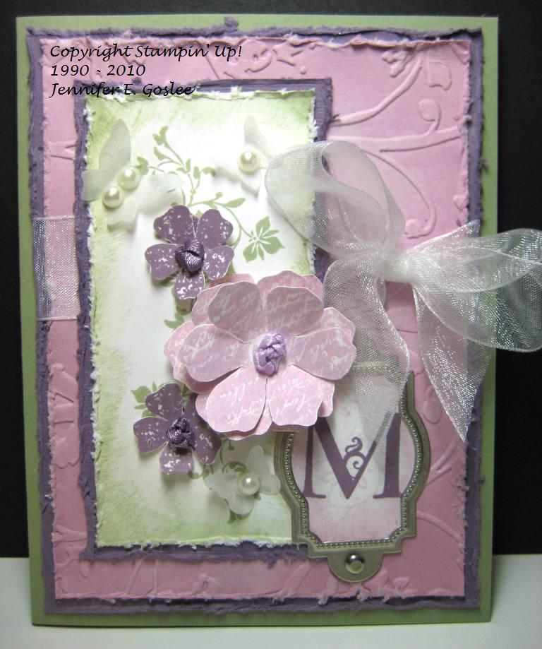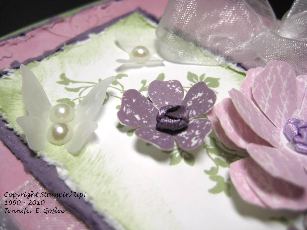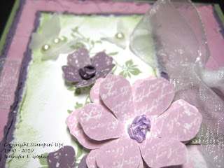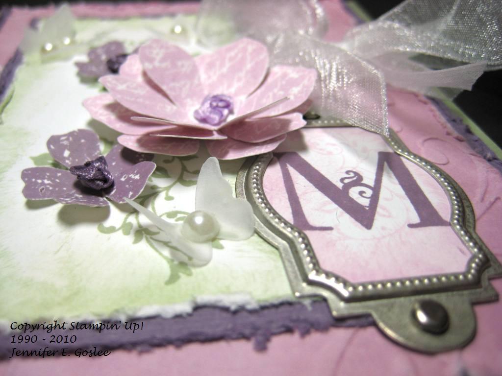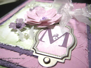I have to admit that I got this card design from a fellow stamper. As soon as I saw it, I fell in love with it and had to re-create it, so here it is. It would be perfect for someone who's name begins with an "M", don't you think? I'm still trying to come up with the perfect card for a friend who has requested a card. This is part of the problem with being a perfectionist... any normal person would make one card and it would be just right. Me?? NNNNOOOO... I have to make card after card after card after card in an effort to get it JUST RIGHT when the recipient would probably be happy with the first thing I made. I know... I need to get some help for this... or maybe I just need to accept that that's who I am! :) This card uses the "Vintage Vogue" stamp set and I used Mellow Moss, Perfect Plum, Pale Plum, and Whisper White cardstock and ink. The butterflies were cut from vellum using the "Beautiful Wings" Embosslit die and I added half pearls for their bodies. The monogram is from the "Lovely Letters Alphabet" stamp set and was added to the card using Hodgepodge Hardware in Styled Silver. The flowers were stamped and then cut out by hand. The center of each flower was made by knotting ribbon, punching a hole in the flower center, and running the tails of the ribbon through to the back. The edges of all layers were sponged and distressed, with the exception of the base layer. I LOVE, LOVE this card!!! The dimension is just amazing and the pics really don't do it justice. To view larger images, just click on the pics.