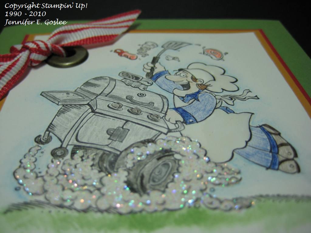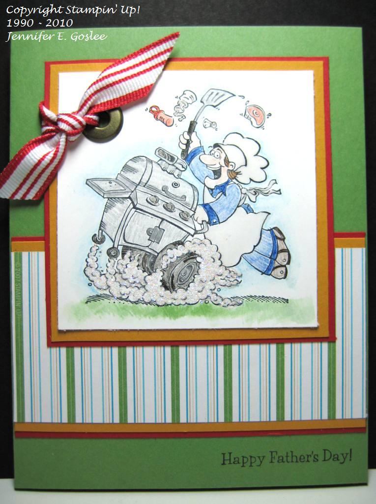 I've had this stamp set (King of the Grill) for a while and haven't had a chance to use it yet, so spent a little time in the "woman cave" today trying to come up with some ideas for Father's Day cards. I LOVE the way this turned out, even though it took quite a while. I used the East Coast Prep Designer Series Paper with coordinating cardstock. The image was stamped in Jet Black StazOn and then I used watercolor crayons, watercolor pencils, and metallic pencils to color it. I used a glue pen with Dazzling Diamonds on the smoke from the wheels (I COULDN'T leave the glitter out!!) and Crystal Effects on the apron and hat to give them some dimension. A jumbo eyelet was set in the upper left-hand corner and I knotted (that sounds better than "tied a bow" for a manly card) a piece of Real Red Striped Grosgrain ribbon through it. Super cute card, if you ask me!! (To view larger images, click on the photos below.)