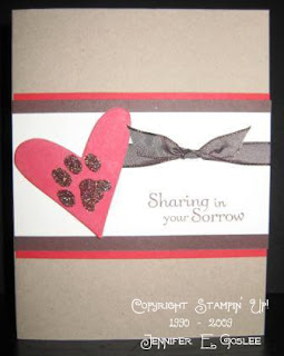 Here are the deets on this card. Everything is from Stampin' Up! with the exception of the paw print stamp. I "painted" the chipboard heart with Real Red craft ink and let it dry before stamping the paw print in Chocolate Chip craft ink and heat embossing with Irridescent Ice. The card base is Kraft with layers of Real Red, Chocolate Chip, and Very Vanilla. The sentiment was stamped in Chocolate Chip classic ink. The ribbon is SU!'s Chocolate Chip taffeta.