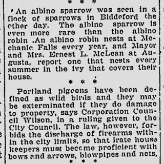 I'm always curious about mentions of anomalous bird sightings, and sightings of albino animals in Maine. The pigeon article was a bonus, if only for the tongue-in-cheek joke about the potential need for Portlanders to develop their (hitherto unknown) blowpipe skills.