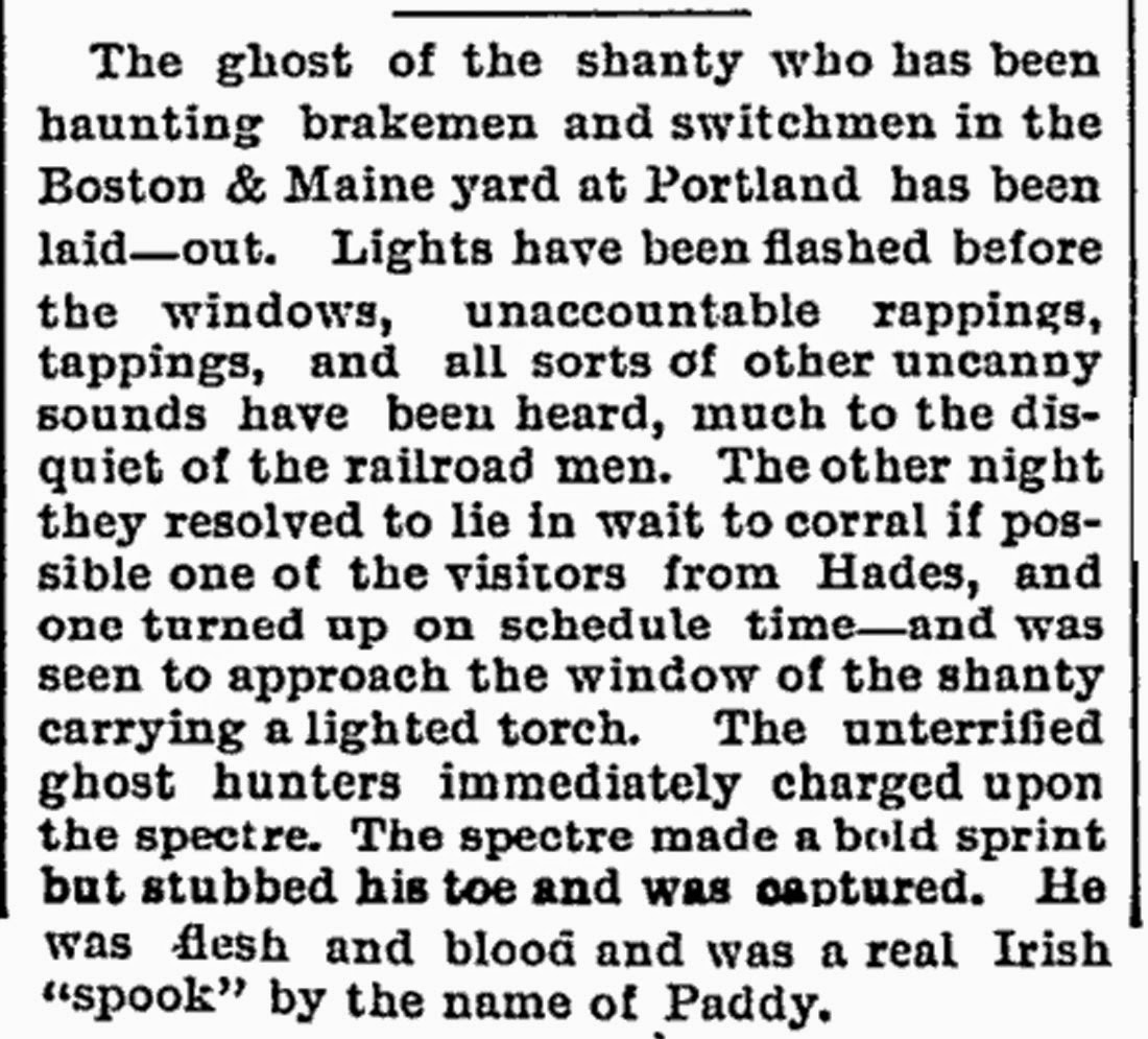 The ghost of the shanty who has been haunting brakemen and switchmen in the Boston & Maine yard at Portland has been laid-out. Lights have been flashed before the windows, unaccountable rappings, tappings, and all sorts of other uncanny sounds have been heard, much to the disquiet of the railroad men. The other night they resolved to lie in wait to corral if possible one of the visitors from Hades, and one turned up on schedule time -- and was seen to approach the window of the shanty carrying a lighted torch. The unterrified ghost hunters immediately charged upon the spectre. The spectre made a bold sprint but stubbed his toe and was captured. He was flesh and blood and was a real Irish "spook" by the name of Paddy.